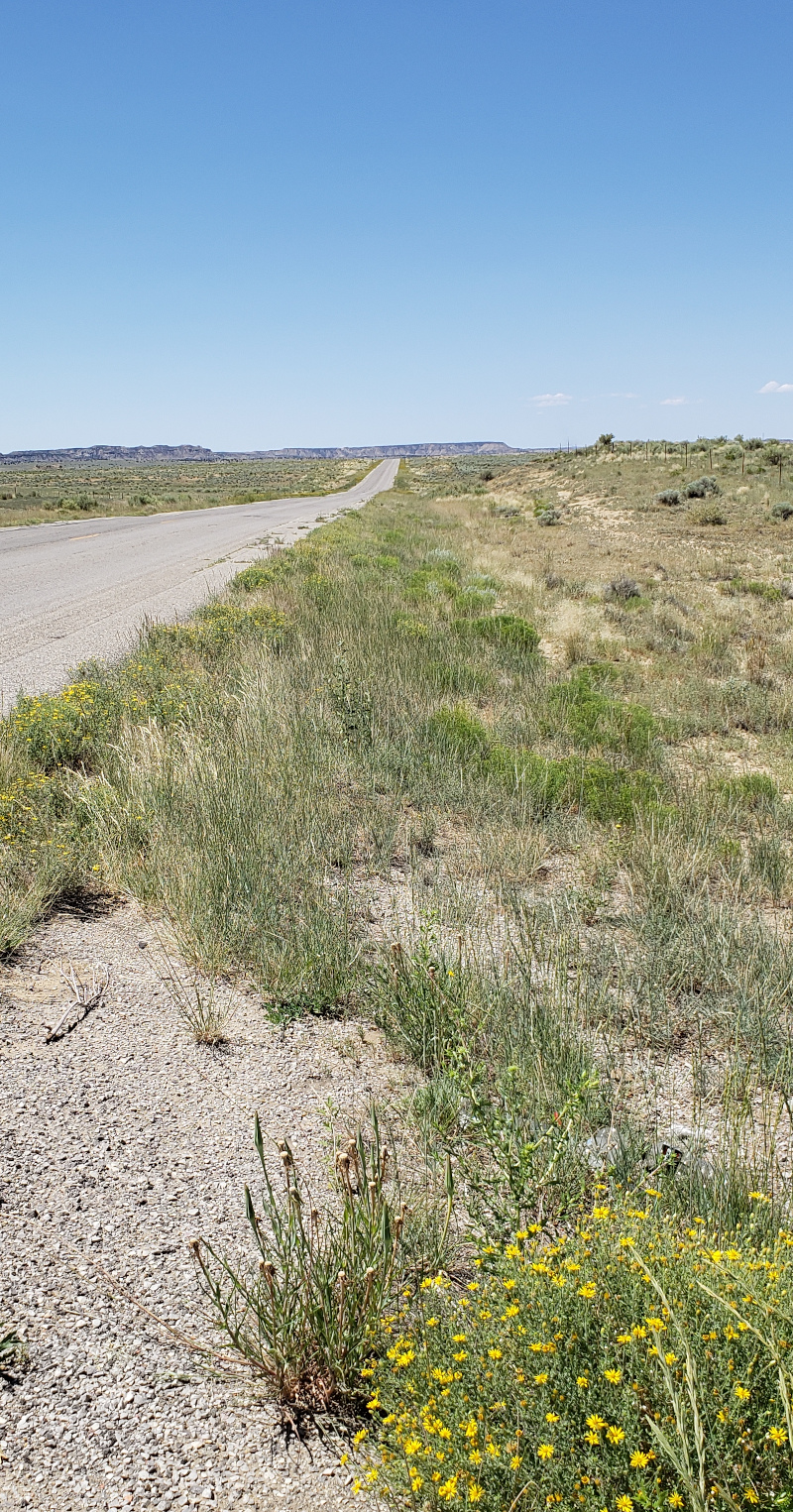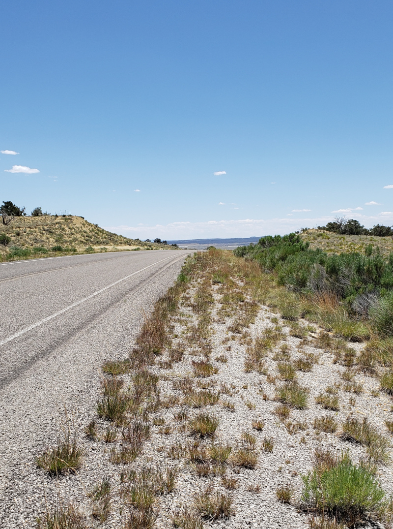 Cuba, NM (10 July 2019) It was about 120 miles from Cuba to Grants, New Mexico. The Tour Divide route took us across the Navajo Nation on paved roads with very little climbing. It was not clear what services would be available along the route so I loaded the bladder with Gatorade with the thought that if needed, nearly six liters of fluids would be enough for the entire trip. Gatorade was necessary to stave off the chemical taste of lingering insecticide which survived my best efforts to expunge. The morning was clear and cool but warmed quickly. Not long after leaving Cuba the route headed off onto a secondary road. The odd thing was the GPS track was not aligned with the road. It was clearly just an error in the GPS file and it was easy to follow the intended route with guidance from the eTrex navigation device which was relied upon for navigation. The device was configured to show the route, my position relative to it and the distance my position was from being exactly on the track (distance off track). Most of the time, distance off track was given in feet. Depending on the width of the road this was usually zero to 20 feet. Whenever this number reached 50 feet or more, the route would need to be checked to be sure I wasn't off course. The main screen also displayed an arrow which pointed to the course. When off course, the arrow generally pointed back to where the course was left. Consequently, the feet off course became miles as progress was made on the correct route which was just a quarter mile to the west of the errant track. The eTrex gave no warnings and made no sounds. In these situations the passive nature of the device works well. At a glance, I could see my progress along the parallel path to the errant track without the device bothering me with this detail. My crossing of the Navajo Nation land didn't require any special considerations when traveling the roads by bicycle. I read prior that people were told by locals that bicyclists are often harassed. My experience was similar to those that were warned -- the people were kind and welcoming. Perhaps these warnings say more about the people giving them than anything else. I was very grateful for two stops provided by the Navajo. First a convenience store where the proprietor was very friendly and second was a laundromat where a group of locals greeted me with tired glances. My appearance was not enough to release these folks from the grip of boredom it seemed.
